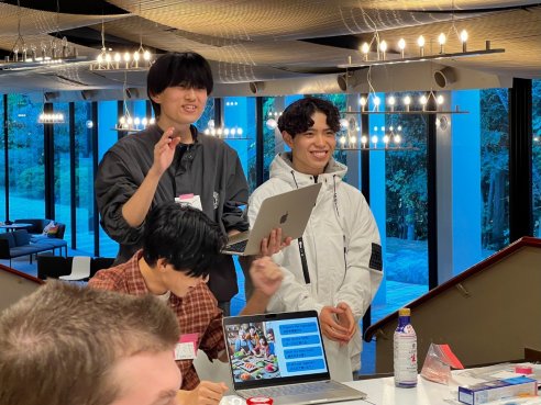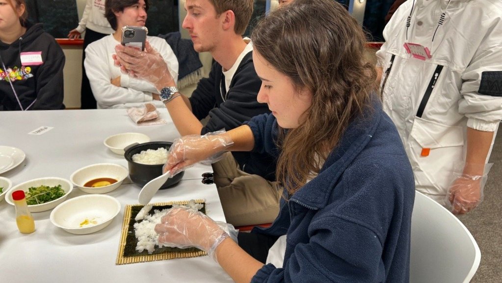 巻き寿司や手毬ずしのつくり方もプレゼン形式で学生たちに発表してもらい、いざ、巻き簀を使って巻き寿司をつくります。海苔の上にご飯を薄く敷き、好きな具材を並べて巻いていく。留学生たちも見よう見まねで挑戦し、サポートを受けながら綺麗に巻くことができていました。自分で巻いた巻き寿司は一本を一人で食べてしまうほど気に入ったようで、学生たちも言葉の壁はありながらも、身振り手振りを使ったり、どうにかして伝えようとすれば伝わるということを学ぶことができた研修となりました。