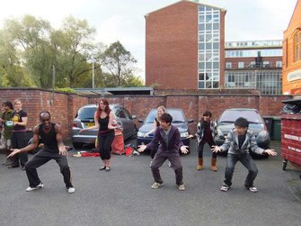 学校のテラスのような場所でハンバーガーなどを食べブラジルのダンスを見ました。