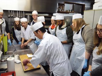 11月19日に恵那市国際交流協会主催の寿司作り体験およびワールドカフェ2017に本学の交換留学生11名が参加しました。寿司作り体験では、恵那市の金寿司さんにお世話になり、鰺の三枚下ろしから始まり巻寿司、握り寿司を丁寧な指導のもと寿司作りを体験しました。