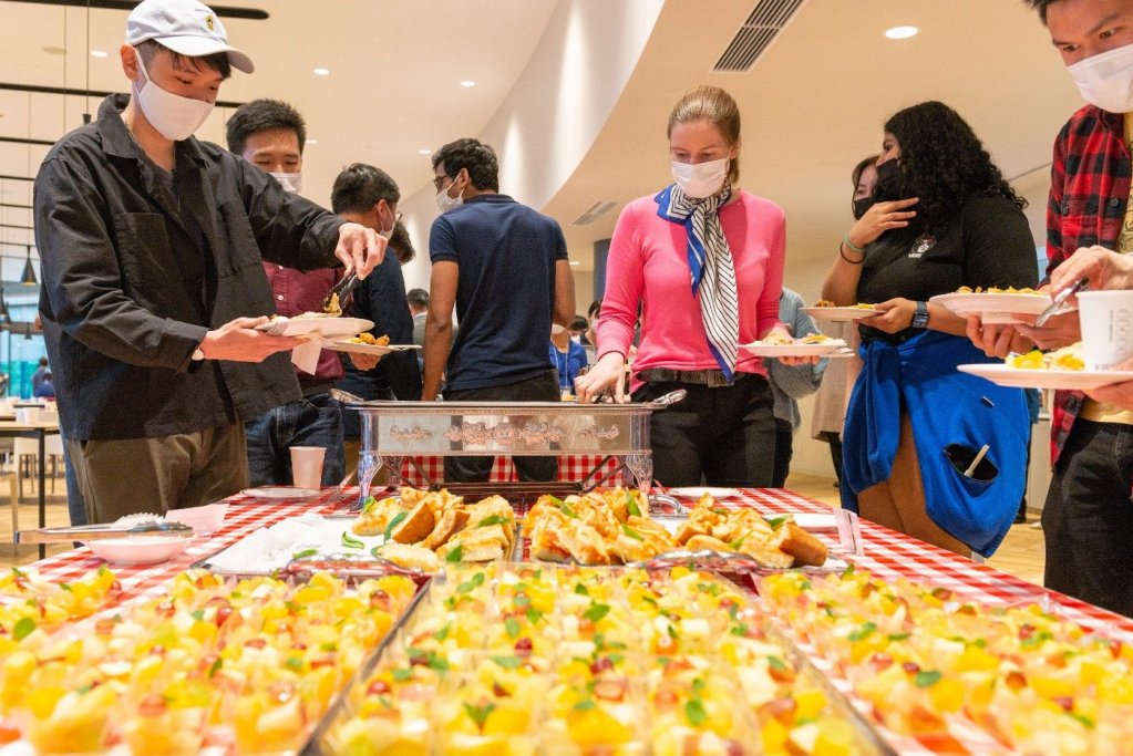 日本食を代表する寿司をはじめ、白身魚のフライ、ローストポーク、スイートチリチキン、ピザ、ペンネなど国際色豊かな料理で留学生をもてなしました。今回のウェルカムパーティーは過去最大規模の総勢200名以上が集まり大盛況となりました。会場では英語が飛び交い、終始笑顔が絶えない様子。留学生は今回のパーティーを通じて、これから始まる名商大でのキャンパスライフに大いに期待を膨らませたことでしょう。名古屋商科大学では、世界トップレベルの海外提携校からの留学生が年々増え続けており、学内でも国際交流を盛んに行うことができます。