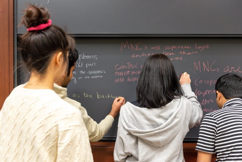 まずは前回の授業を振り返るため、各自で学習したことを黒板に書き出していきます。Townley教授からはそれぞれのコメントへの鋭い指摘と質問が投げかけられ、学生たちの理解力が試されます。その後は、小グループに分かれ学生同士でディスカッションをし、グループごとに意見発表を行います。学生たちは積極的に自分の考えを述べ、グループ内での見解をまとめ、それに基づいてさらに各グループで意見交換をします。