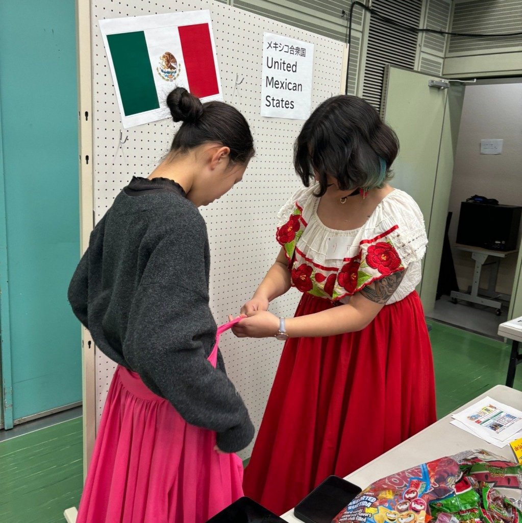 イベントはグループでの自己紹介からスタート。お互いの名前を呼びやすくするため、留学生は名前をカタカナで、日本人はローマ字で、名前シールをつくります。カタカナを書くのがまだ慣れない留学生に、同じグループの方がサポートをしてくださったりと、仲を深めるきっかけになりました。続いて、日進市剣道連盟様による剣舞の披露や剣道の精神の紹介、そして名古屋商科大学から留学生3名がそれぞれの母国、アルゼンチン、メキシコ、東ティモールについての紹介をしました。それぞれの国の特徴や歴史などの紹介に加え、メキシコにルーツを持つLisaは、最後にメキシカンダンスの一部を披露してくれました。