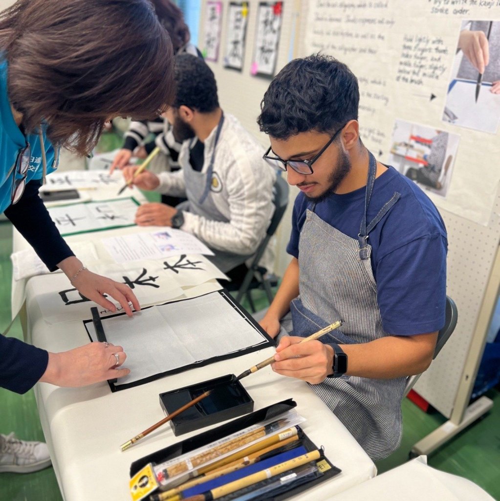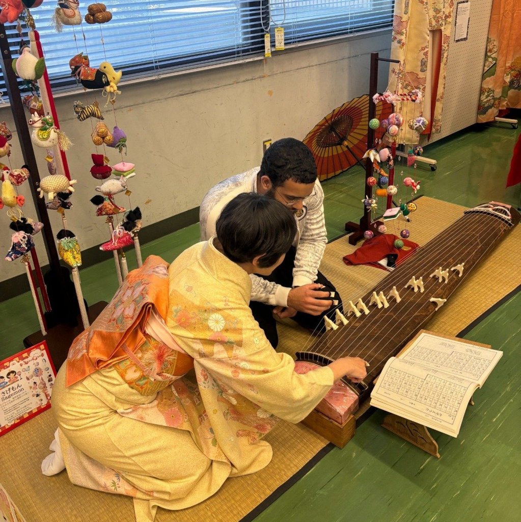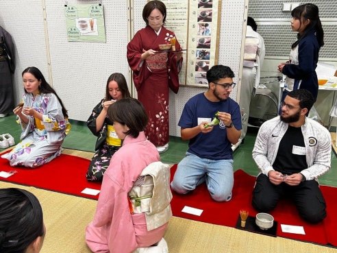 発表の後には、茶道、書道、剣道、お琴といった日本文化を体験できるコーナーを自由に巡ります。剣道の体験では、裸足になり、声を張り上げて竹刀を振るという実践的な体験に、大興奮。その他にも茶道の作法について学び、抹茶を点てたり、書道やお琴など、様々な日本文化に触れることができ、留学生たちは大満足の様子でした。