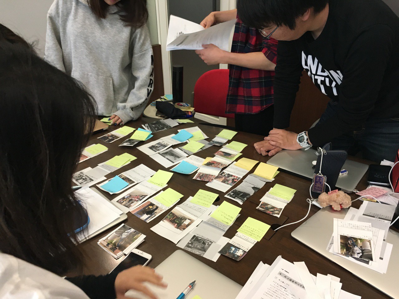 前回集めた写真資料を元に考察が始まります。今回はKJ法と呼ばれる集めた資料の収束技法を用い、無意識の行動からどのようなことが読み取れるか、グループで意見を出し合います。色の異なる付箋で項目分けをしながら、普段気にすることのなかった「行動」や「もの」に、どんな意味があるのか追求していきます。これまでお客さんとしてしか大須商店街へ行ったことのなかった学生たちも、お店側の立場で考えることにより「経営者の目線」も取り入れることができたようです。