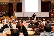 授業は、「配偶者や大学生の子供を養っている状況で、自分が働く会社が汚染されたお米を売っていると知ったら内部告発を行うか」という主題に基づき進行。グループワークが始まってすぐに教室内は学生たちの活発な議論の声で溢れ、アクティブラーニングならではの光景が広がりました。議論の結果、告発すると回答した学生は65名、告発しないと回答した学生30名という結果に。告発するとした学生からは「不正を知ってそのまま働くことはできない」「個人の事情より社会に与える悪影響を考えると見過ごせない」といった意見が、告発しないとした学生からは「告発することで解雇や倒産のリスクがある」「自分がやらずとも他の誰かがやるだろう」との意見が次々と寄せられました。クラス討議では吉井教授から「では別の条件だったらどう思うだろうか?」など、考察を深めるための質問が学生に投げかけられ、授業はさらに白熱していきました。