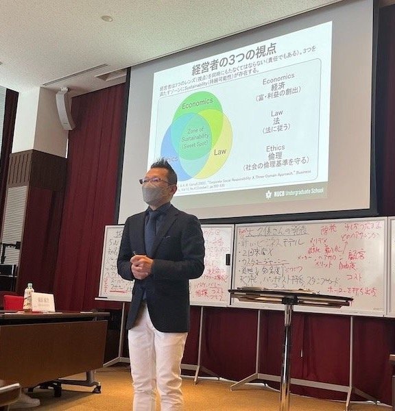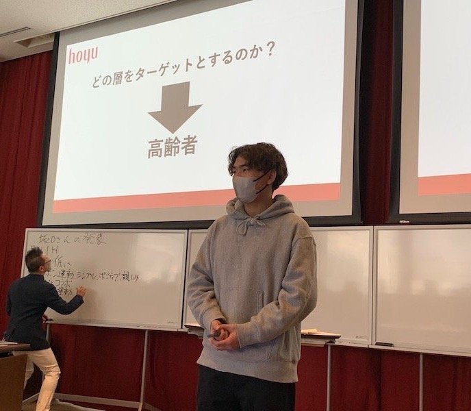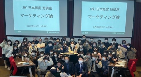 小野裕二教授の「マーケティング入門」の授業は、名古屋商科大学と株式会社日本経営との産学連携の一環として、株式会社日本経営からの寄付金を財源に、マーケティングの最前線で活躍する人材をゲストスピーカーとして招いて開設される講座です。今回の授業では、ホーユー株式会社の事例を用いた議論を通して、マーケティングの仕組みを学修します。