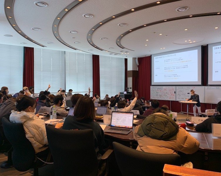 今回のケースでは、ヘアカラー剤使用時に必要な皮膚アレルギーテスト(パッチテスト)の啓発活動と実際にヘアサロンで実施されるための仕組みづくりが設定されています。ホーユーはアレルギーの方が増加している中でヘアカラー業界のリーディングカンパニーとして啓発活動を推進しなければならない。一方でアレルギーへのリスクを啓発することは市場の縮小に繋がる可能性がある。こうした状況下において、自分が同社の担当者なら今後どのようなマーケティングを展開するのかについて議論していきます。予算に限りがある中で具体的にどのような媒体や手段を使用するのか、誰にどのように実施すれば良いのか、どうすれば美容室で実施されるようになるのか、正解のない問題を学生主体で議論しました。