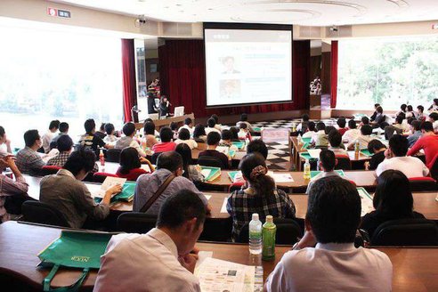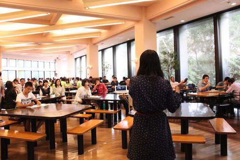 今回はランチ会場でのイベントとして「留学説明会」を行いました。出発したばかりのギャップイヤープログラムの撮れたてムービーや、語学留学を終えたばかりの学生による体験談発表を実施。食事の手を止めて、皆さん聴いていただきました。世界を少し身近に感じていただけたのではないでしょうか。