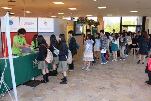 今回は新企画として「世界とつながる体験」を実施。これは、現在ギャップイヤープログラムに参加しているスタッフ(フランス・ルーアン)とネット中継し、現地で活動している在学生の活躍ぶりを録ったビデオ映像を交え、海外体験の魅力をお伝えしました。