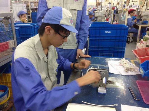 さて、私が働かせていただいているSDベトナムは、ワイヤーハーネスの会社です。ワイヤーハーネスとは、車やエアコンなど、様々な電子機器に使われる配線のことです。この2週間で色々な行程を体験させていただくのですが、今日までに切断圧着行程・組み立て工程・検品行程の3つの行程をやらせていただきました。どの行程もとても地道で、根気がいる作業でした。特に組み立て行程の時は、同じハーネスを1日中ひたすら作り続けました。