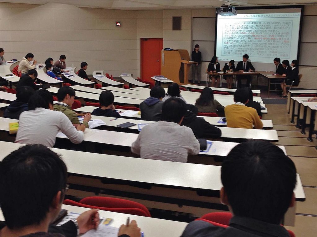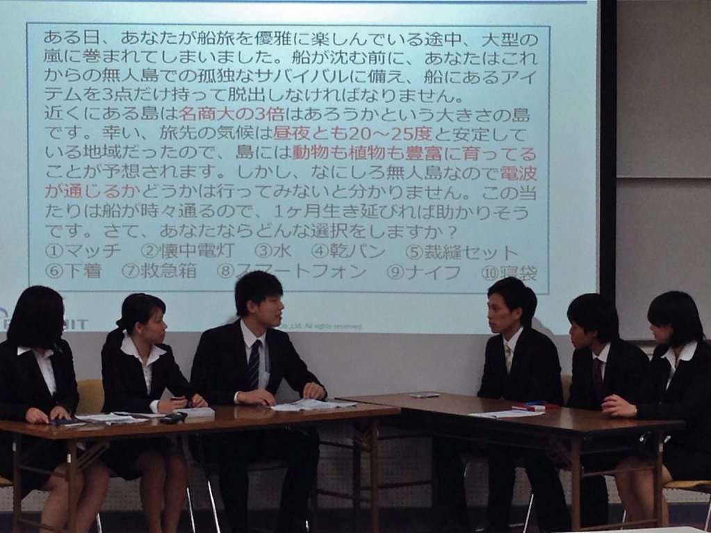 『先輩から後輩へ。』この日、4年生有志NSCS*による、グループディスカッション対策セミナーを開催しました。グループディスカッションは、採用選考の初期に行われることが多いものの履歴書や面接試験と違い、イメージや1人での対策がし辛いものです。今回は、そんなグループディスカッションで落ちないために、心がけておくべきポイントをデモンストレーションを交えて、後輩へ伝えていました。