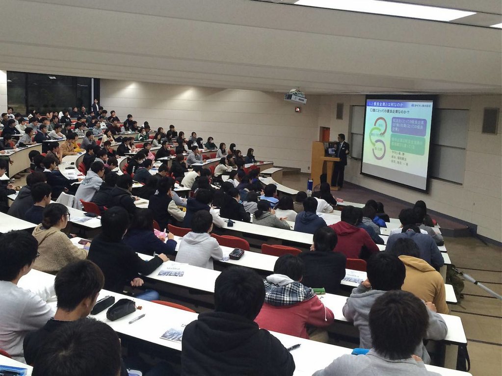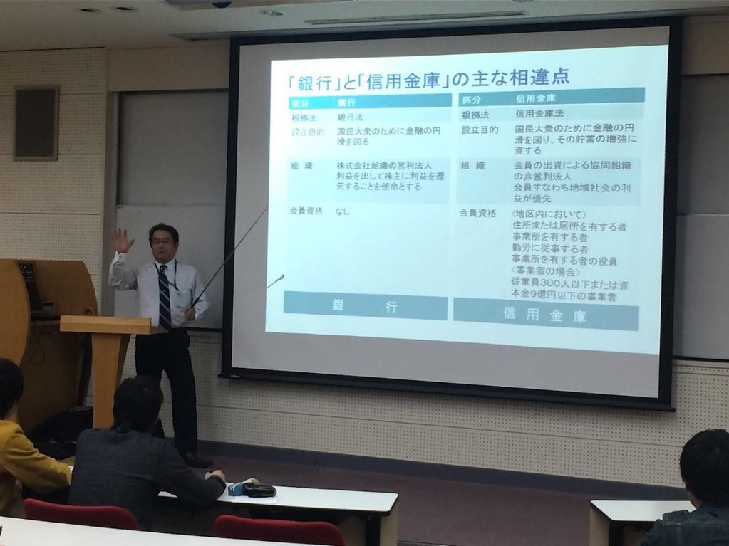 この業界研究セミナーは、実際の企業採用担当者にお越しいただき、自社の業界や求める社員像などを語っていただくことが特徴です。この日は、卸売業、金融業、小売業から3名をお招きし、学生たちは希望する業界の教室でしっかりと学びました。社会で活躍する、また採用する立場の講師ならではの、実際の仕事の話も盛りだくさん話していただき、抱いていたイメージとのギャップに気付いた学生も多くいたことでしょう。