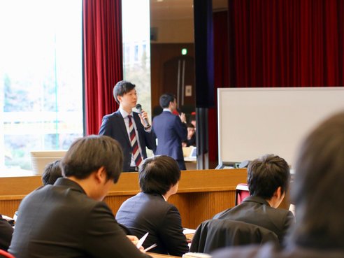 午後からのOBOG交流会では、学生は興味のある企業のブースに移動し、話を伺いました。参加者は各30分、合計3社のブースを回ることができます。卒業生の方には、自身の勤め先についての説明はもちろん、業界や就職活動に関すること、さらには入社後に味わった社会人としての苦労についても話していただきました。学生は学外の合同企業説明会では躊躇してしまうような質問もすることができ、実りの多い時間になったようです。3月1日の就活解禁日まで残りわずかとなりました。卒業生の先輩方からいただいたエールを胸に就活に励んでいただきたいと思います。