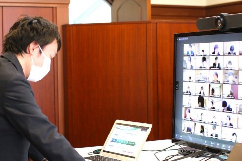 今年は企業の人事担当者を本学日進キャンパスにお招きし、ライブバーチャル(オンライン)専用の部屋にて30分間で業界説明と企業説明を行なっていただきます。学生は自宅からパソコンを使用して参加し、開催中は気になる企業の担当者に自由に質問をすることができます。とある愛知を拠点に展開している証券会社の説明会では担当者への質問が止むことなく、参加した学生の意欲の高さをうかがい知ることができました。学生たちは1日あたり午前4社、午後4社の計8社の企業の説明を聞くことができ、全ての日程に参加すると、43社(初日のみ午後からの実施で3社を選択)と接点を持つことができます。