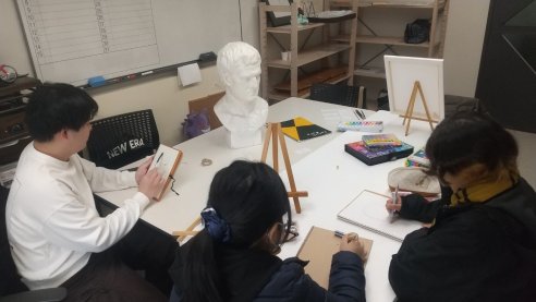 火曜の昼休みに部室に集まり展示会の会議や相談などを行い、水曜の昼休みにはデッサン会などを行っています。普段の活動、普段の活動は作品作り以外にも学年関係なくそれぞれの趣味のことを話すなど、とても充実しています。