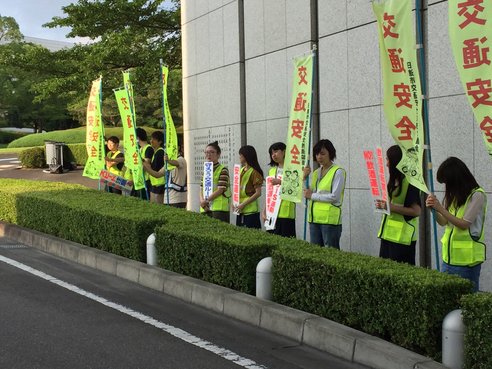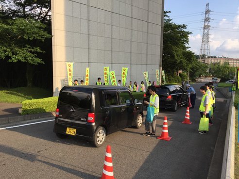 当日は正門にて安全運転を呼びかけるのぼりを持ち、粗品を配布しながらドライバー一人ひとりに運動重点を呼びかけました。