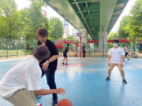 このサークルでは、思いっきり体を動かして、交流を深めるのが目的です。部長は、バスケットボールの経験があるので、教えることもできます。