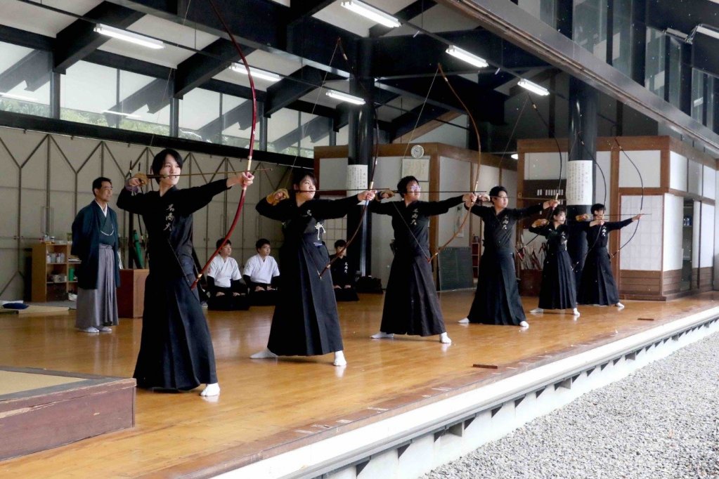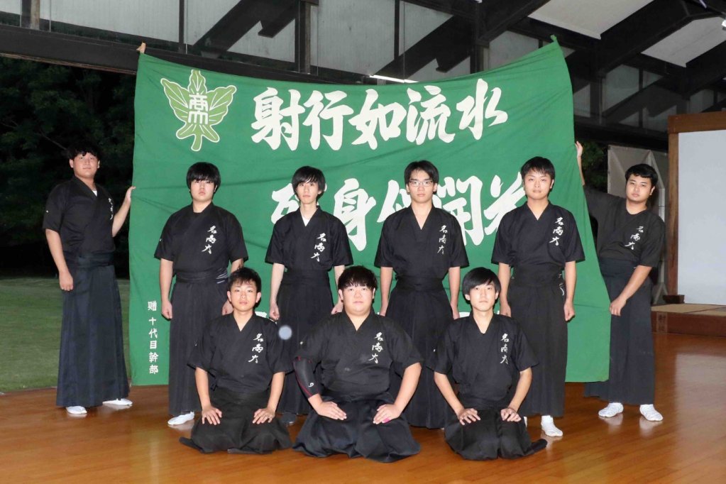 弓道部は男子9名、女子3名の12名で、火・木・金・土曜日の週4日間で活動しています。弓道部専用の弓道場が日進キャンパス内にあります。その広さは県内屈指の広さを誇り、近的射場では最大十的立てられるようになっています。また、その弓道場には遠的射場も併設されており、本来の28m先の的を狙う近的競技だけでなく、60m先の的を狙う遠的競技も行うことができます。自然に囲まれ、充実した設備と落ち着いた環境で練習に取り組み、リーグ昇格や大会での優勝を目指して取り組んでいます。