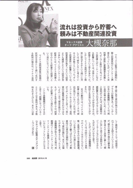 今回のマイナス金利導入は、個人投資家にとっては評価される一方で、金融機関にとってはあまりメリットがなく、デフレ脱却にはそれほど寄与しない。それでも不動産向けの貸し出しが伸びており、やり方によっては希望はあるなど、金融のプロとして今後の見通しまで述べられています。
