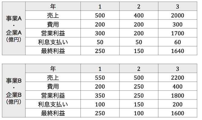また、最終利益について考えると、事業Aが3年間で2,040億円、事業Bが1,950億円です。このように視点を変えると意見が異なることがわかります。