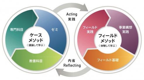 この事業では「ケースメソッド」と「フィールドメソッド」を効果的に組み合わせた集中プログラムを編成。フィールドメソッドを本格的に導入することで、学外実習でビジネスを実体験することができます。また授業科目の精選を進め、質と密度の高い学修を実現。ケースメソッドとフィールドメソッドの相乗効果により、問題解決能力やコミュニケーション能力を備えた未来のリーダーを養成します。