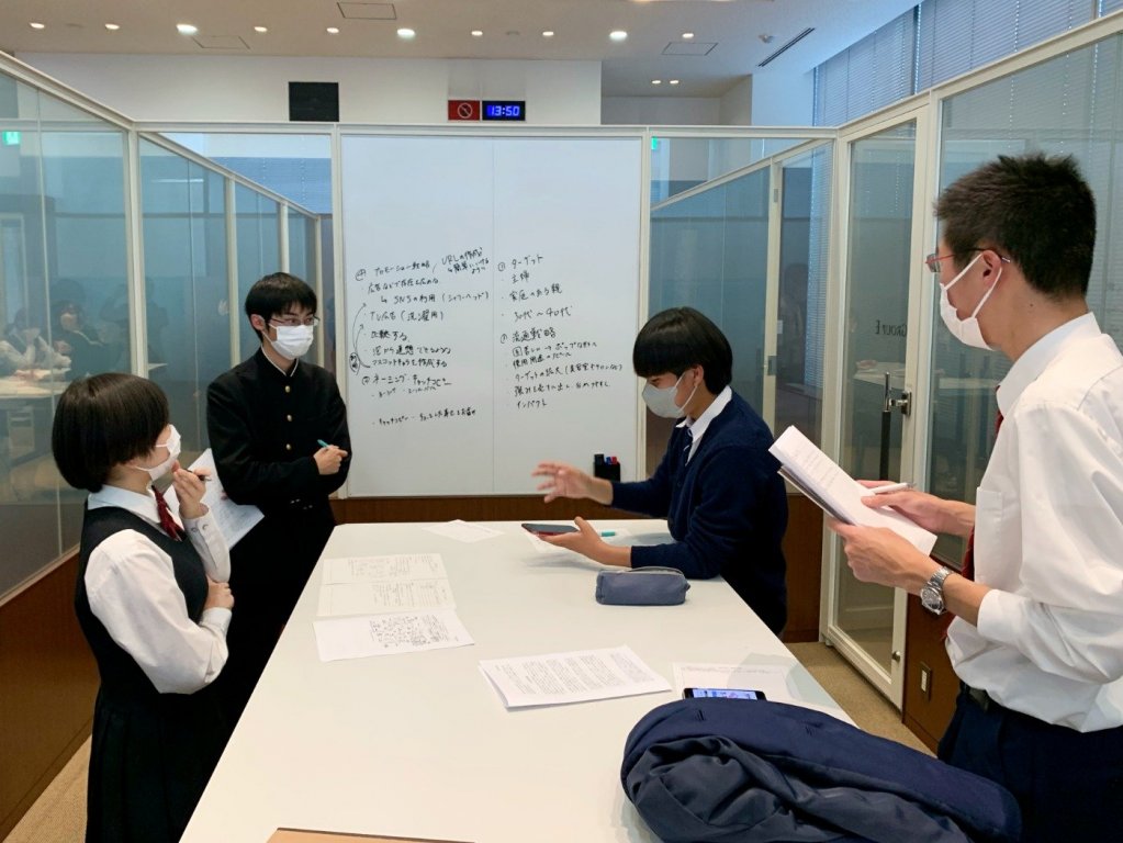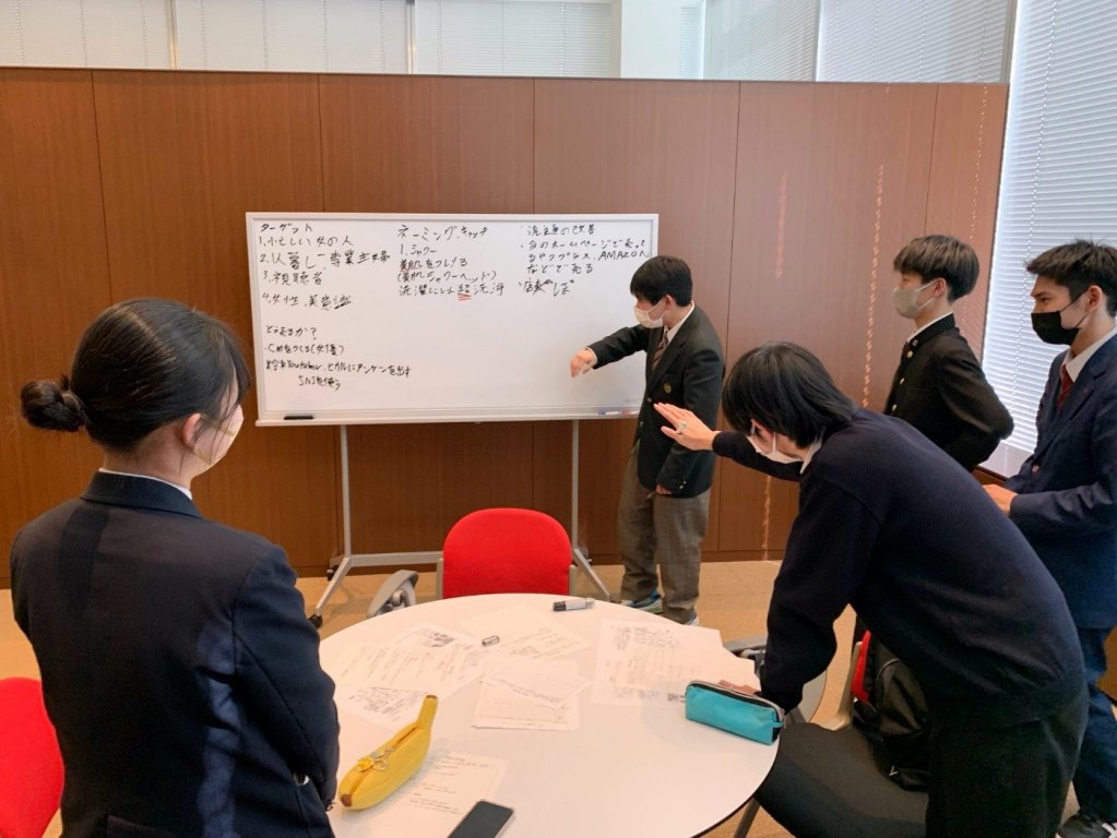 有名企業5社(トヨタ自動車、P&G、良品計画、Salesforce、大正製薬)のPR動画を見て、その効果を分析し、動画マーケティングのあり方について学びました。各社の動画にはどのような戦略が隠れているのか。動画の有効性を検討しました。後半は、あるBtoB中小企業のWebサイトを取り上げ、訴求力を高めるプロモーション戦略をグループごとに考えました。誰にどんな情報をどのように届けるべきか。高校生ならではの発想で意見を交わします。最後に、グループの代表者がプレゼン発表を行いました。商品のキャッチフレーズやECサイトの改善策、SNSの活用など、高校生マーケターが企業のプロモーション戦略を提案します。発表後には、小野教授より講評をいただき、2日間の授業を締めくくりました。