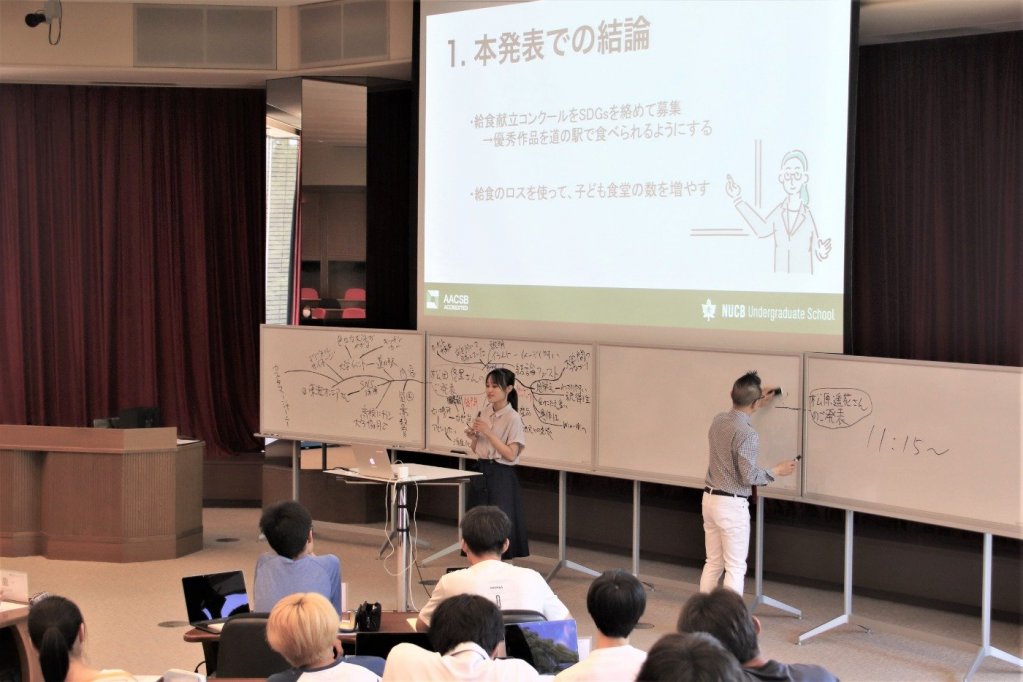 小野裕二教授による「マーケティング論」授業では「マーケティング視点でSDGs啓発アイデアを提案」というテーマで、名古屋商科大学のキャンパスがある日進市とコラボレーションをして授業が行われました。