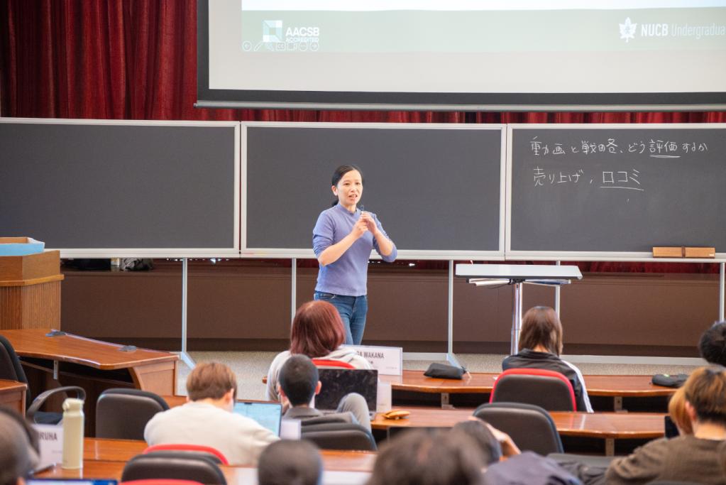 まず、動画作成者が主人公のケースを元に授業が進んでいきます。今回のケースの主人公は、仕事で新製品のブランド認知動画を作成しました。この動画は、見た目が素晴らしく、再生回数も順調に伸びていました。ところが、会社の売上にはつながっていないことがわかりました。企業にとって本当に“よい”動画とは、どのような動画なのでしょうか。どのような指標があれば、動画の成功を判断できるのでしょうか。この問題について、学生たちはチームで話し合い、発表しました。