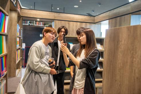 各グループごとにマーケティング対象者を意識し、ケースで学んだ動画制作の指標や目的を見失わないように気をつけながら、学内の食堂SORA CAFÉとブックカフェ丸善へ取材に行きました。あるグループは、新入生に向けてSORA CAFÉの食券の購入方法からグループワークの打ち合わせ場所まで、幅広い活用方法を紹介していました。また、あるグループは、在学生に向けて丸善での参考書や本の見つけ方を紹介していました。どうすれば見続けてもらえる動画が撮れるのか、何をどのタイミングで映すのかなど、どのグループも写り方や撮り方を工夫しながら動画の撮影を進めていきます。