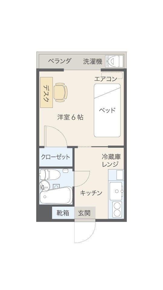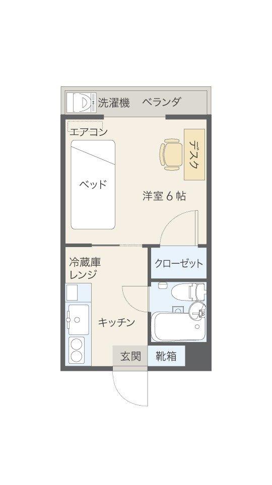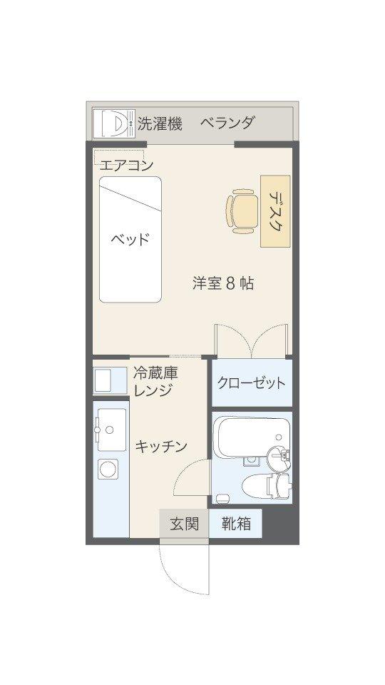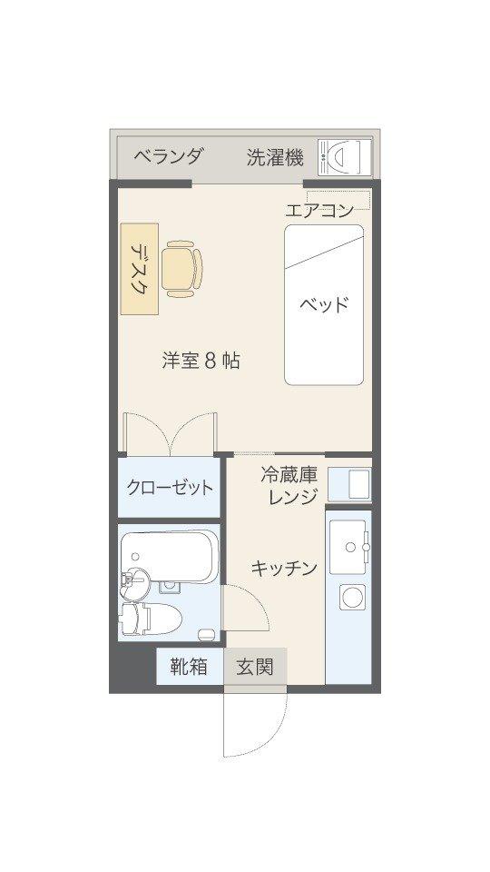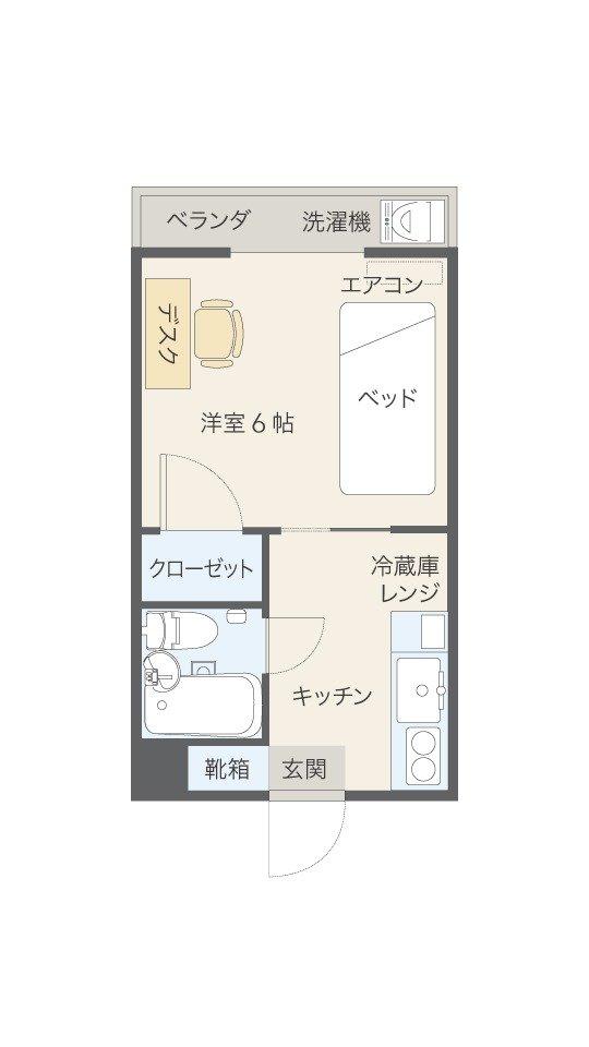 居室は第一・第三は6帖、第二は8帖のワンルームマンションタイプ(フローリング仕様)です。キッチン・トイレ・バスルームはもちろんのこと、エアコン及びベッド[ベッドマットは各自で用意]が備え付いています。家具、家電製品備え付けのため、入寮時に購入する必要はありません。(第一:24室/3階建、第二:29室/5階建、第三:24室/4階建)