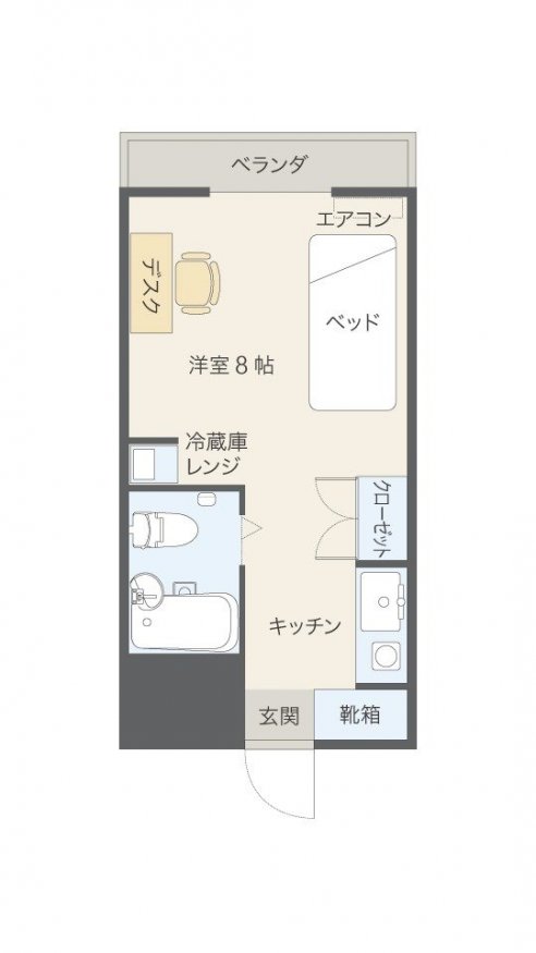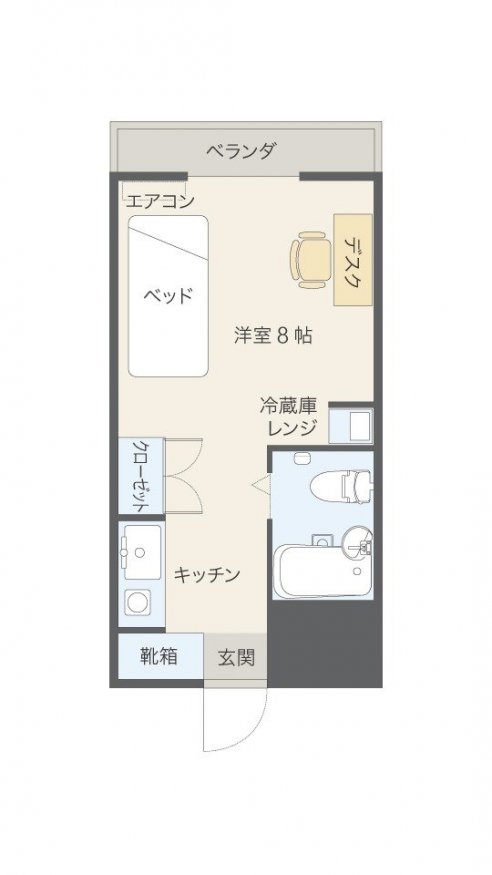 キッチン/バス・トイレ(ユニットタイプ)/机/椅子/ベッド[ベッドマットは各自で用意]/エアコン/冷蔵庫/IH/電子レンジ/照明器具