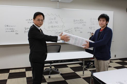 祝賀会では講師の金岡先生から記念品を授与されたあと、合格体験談を発表しました。