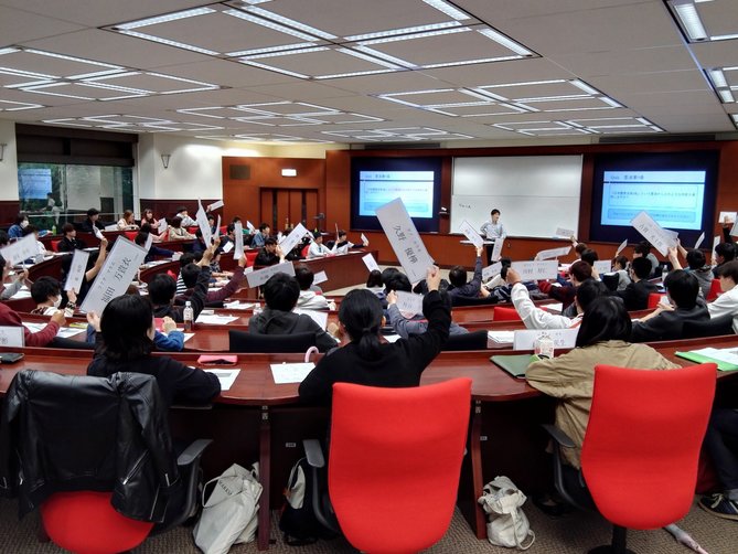 大学は、専門的な知識を身に付けるだけでなく、様々な事柄について論理的に考え、理解し、活用するために必要な幅広い教養を学ぶところでもあります。北村貴先生の「日本国憲法」もその一つです。今回の講義では、日本の歴史や国際情勢を交えながら戦力不保持と自衛隊の関係について理解することが目標とされました。「9条という言葉から何を連想しますか?」という北村先生の問いに、受講生たちは周りの学生と相談しながら考え、ほとんどの学生が自分のネームプレートを挙げ、アクティブに自分の意見を発表していました。9条をどのように捉えるかによって、自分の国を守るための戦争をしていいのかどうかの捉え方に違いも生まれることを学びました。正解を教えるのではなく、どの考え方が自分にしっくりくるのかを考えさせる講義でした。