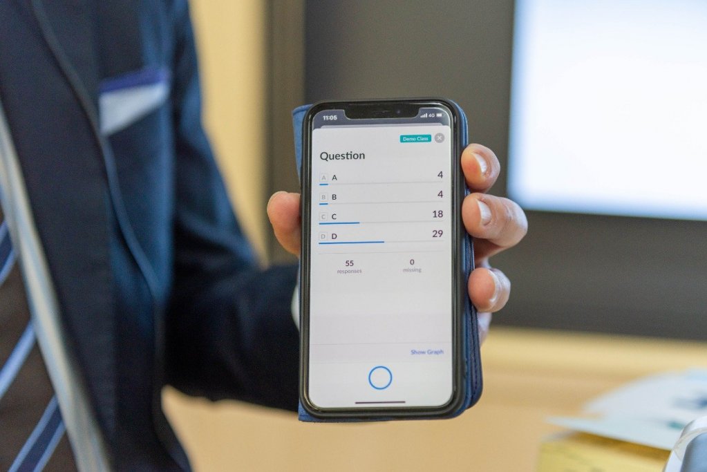 4月に着任された経済学部の山本雅道教授の授業「民法1」では、学生の理解度を確認するために、スマホでリアルタイムにアンケートを取ることができるPlickersというツールを活用しています。