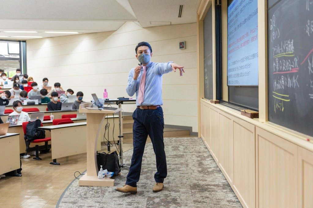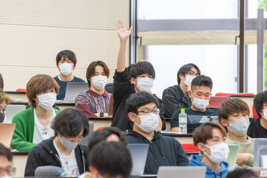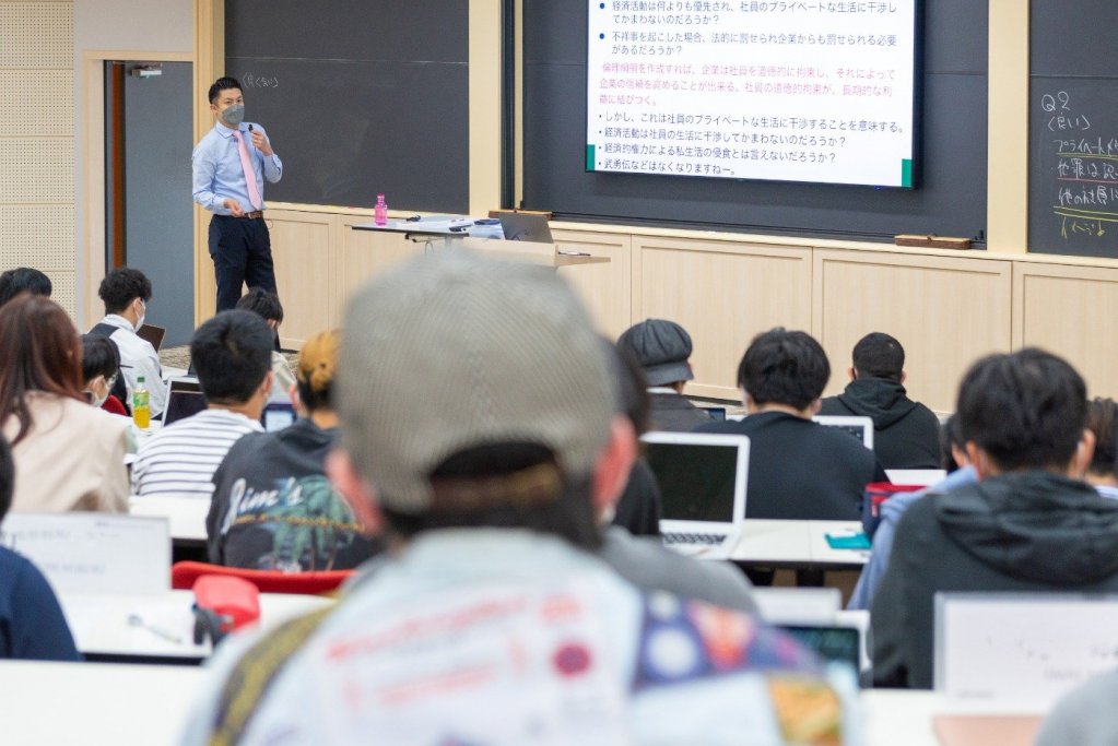 経済学部の吉井哲教授による「経済倫理」の授業の様子です。今回は「会社は社員のプライベートな生活に干渉してよいか?」というケースを用いて、企業の倫理綱領について議論が交わされました。「他の社員に迷惑がかかるから定めた方がよい」「判断や主体性が損なわれるので定めない方がよい」など、それぞれの立場から、なぜそのように考えたのか、学生たちは積極的に意見を述べていました。