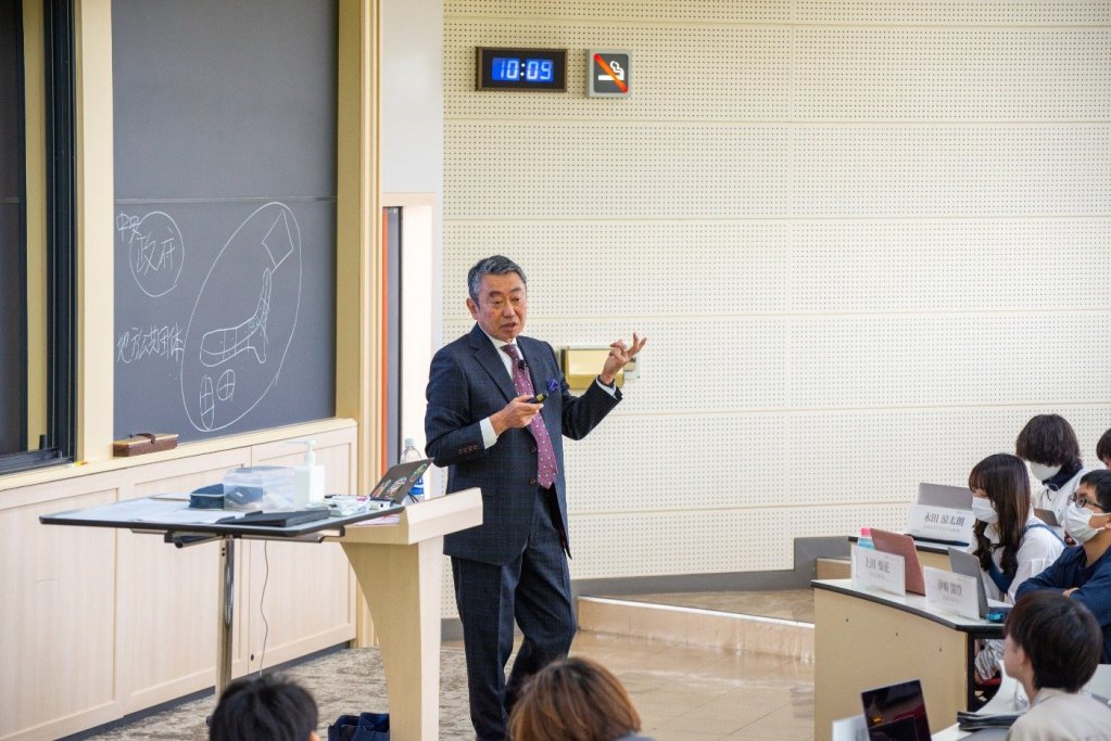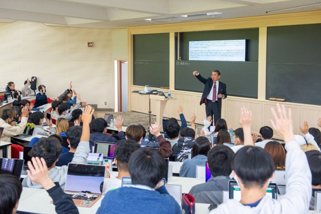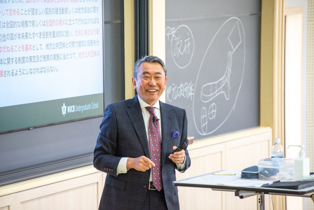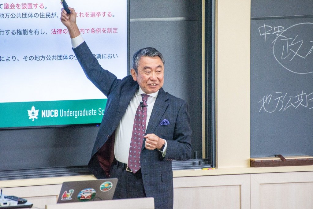 永久教授による「行政学」の授業の様子です。この日は「行政における中央と地方の関係」というテーマで授業が行われました。授業の後半では「放射線の監視は国が行うべきか地方が行うべきか?」というケースを用いて、放射線の監視は国と地方が別々に行なった方が良いのか、それとも統合して行なった方が良いのかを議論しました。