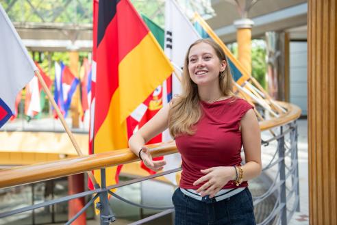My favorite spot is the terrace in front of the building that connects the cafeteria, some classrooms, and the 7-Eleven. It’s surrounded by trees and greenery, so it feels really calm and refreshing. There’s also always some instrumental music playing in the background, which creates a really nice atmosphere for studying. And if I need a short break, I can just grab a snack or coffee from 7-Eleven, and often I’ll bump into friends there, it’s a great mix of focus and socialising.