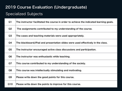 Since 1992, our university has been conducting surveys for all subjects. The survey asks students who took the course whether the teaching method was easy to understand and whether the content was satisfactory. The results of the survey are used to improve the contents of the lecture and to ensure we provide the highest quality of education to our students.