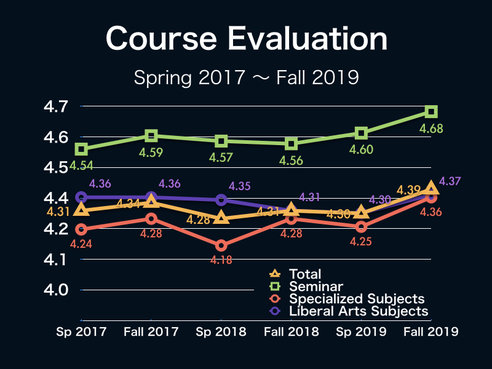The courses are divided into specialized subjects, liberal arts subjects, and seminars, and 200 to 300 types of lessons are held annually. Each average point is constantly maintaining a high number of 4.0 or higher (5-level evaluation). Teachers continue to devise ways to raise students' interest and broaden their horizons.
