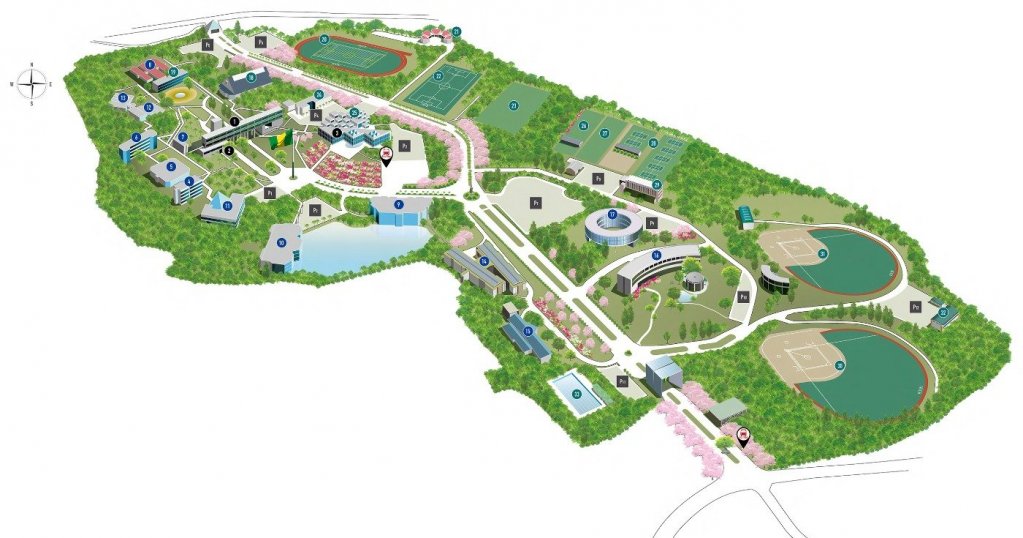 Guests are kindly asked to come to reception at ❶ The Central Administration Building 2F. For those coming to campus by car, please park at P1.