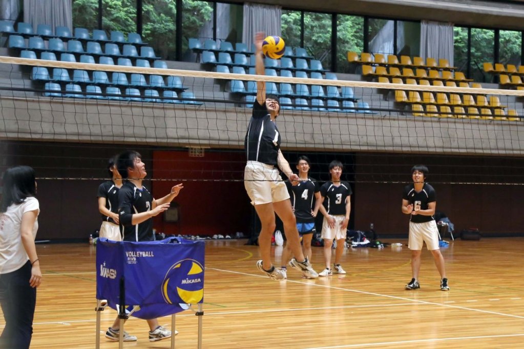At the gymnasium of Nagoya University of Commerce, our men's volleyball club is a team of athletes and managers practicing for a limited time, three times a week on Tuesday, Thursday, and Saturday. We have no leaders in our club activities, so we are practicing our own. We practice warming up, practice spikes, serve cuts, and play red and white in teams. Currently, I am in the 4th division of the Aichi League, and I am practicing every day aiming to be promoted to the 3rd division. Each member is a very interesting team with only a strong individuality.