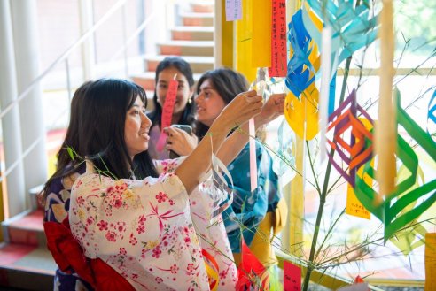 Afterward, everyone got creative by making bamboo branch decorations with origami and writing their wishes on colorful "tanzaku" strips. Wishes were written in Japanese, English, and the languages of the students' home countries, creating a lively, multicultural display of bamboo branches—a characteristic scene at NUCB, which boasts a diverse student body.