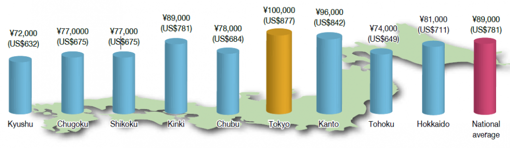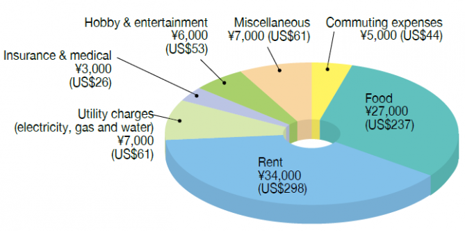Currently, with my two jobs (English school and Consulting company) I make around ¥90,000. I can pay my rent, groceries, phone bill, medical expenses, car-related expenses, entertainment, etc. But I do not pay my tuition fees as I receive total support from my father to pay my school.
