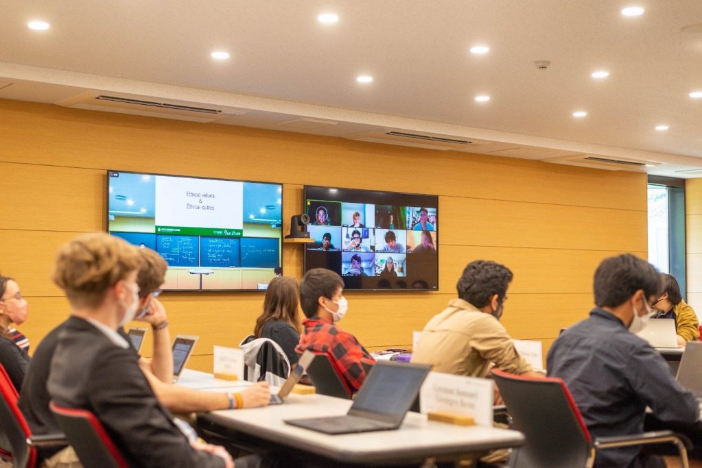 For beginning our Spring semester of the 2022 academic year, the NUCB Undergraduate School debuted its brand new version of the hybrid classroom to seamlessly bring together and connect all our students, physically and virtually at the same time. With the Government of Japan having opened its borders in March and our international students gradually entering the country, students currently in Japan attend the classes on campus while students currently abroad join the session simultaneously online.