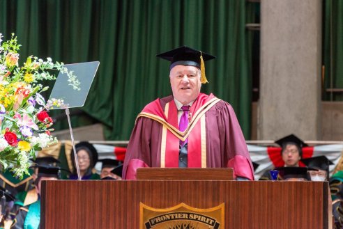 During his ceremonial address, Chancellor Hiroyuki Kurimoto spoke about three themes: "The Mission of Nagoya University of Commerce and Business", "MBA Education", and "Unconventional Dreams". The foundation of education at NUCB is centered around the ability to take action and continue to persist in the face of challenges and failures. Dr. Kurimoto strongly emphasized the importance of adopting an attitude of persistent perseverance, where students should strive to challenge themselves repeatedly, regardless of how many obstacles they may encounter.