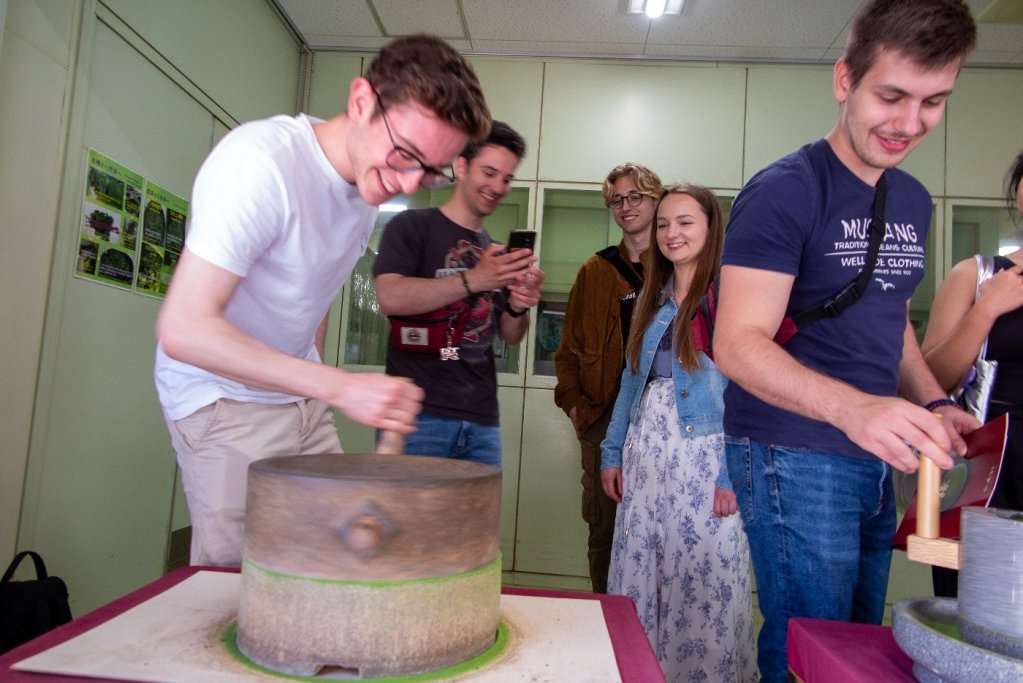 Upon our arrival, the staff of Aoi Sencha warmly greeted us and commenced the tour. We were guided to a tea plantation field where we could see how matcha is grown and harvested. The staff explained to us the time and care needed to properly harvest matcha tea, and many of our students showed a keen interest in this. Moving on, we were guided back to the factory and shown a particular room where the harvested matcha tea is ground down to a fine powder. Students also got a chance to try grinding their own matcha tea using a grinding device known as as "Matcha Usu" (抹茶臼).