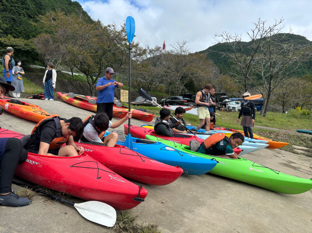 On October 12, NUCB’s full-time Global BBA students and exchange students joined a one-day trip to Ena City in Gifu Prefecture. They experienced kayaking at Kasagi Gorge in cooperation with the IINAKA Club, and later moved to Oi-juku, a post town on the Nakasendo to take part in a Noren workshop and Taiko drum performance, both sponsored by the Nakasendo Noren Contest Committee. It was a wonderful opportunity for the students to connect with Japan’s beautiful nature and the warm local community of Ena.