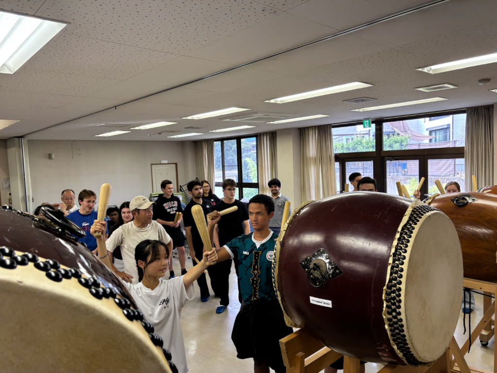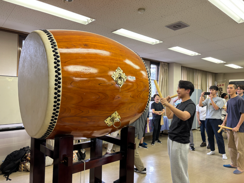 After the Noren painting, members of the Oi Taiko Promotion Association (大井太鼓振興会) gave an impressive Taiko drum performance and then taught the students how to play. Thanks to their clear instruction, the students were able to perform an entire piece together by the end of the session.