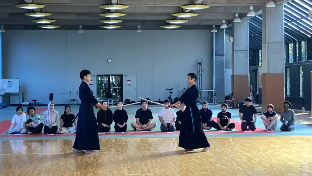 Students first learned how to bow at 15 and 30 degrees, followed by practicing the traditional Japanese sitting style, seiza. For some students, it was a little painful since they weren’t used to sitting that way. After that, two instructors demonstrated the Nippon Kendo Kata using real swords instead of shinai. They looked like real samurais—they were all so captivated that we nearly forgot to breathe!
