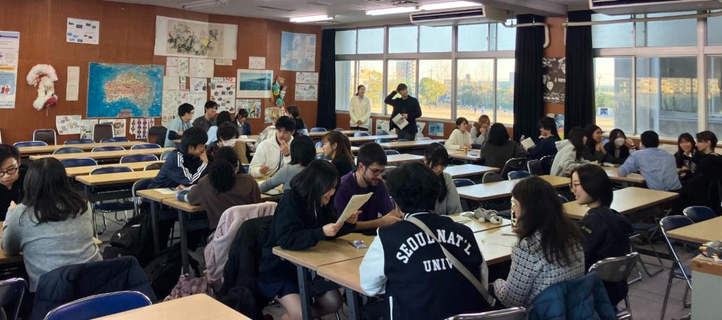 In the second part of the program, all participants gathered in one classroom—23 university students and 24 high school students in total. High school students introduced themselves in English, while international students introduced themselves in Japanese. Even deciding the speaking order became an opportunity for communication, as students compared wake-up times, phone battery levels, and upcoming birthdays.